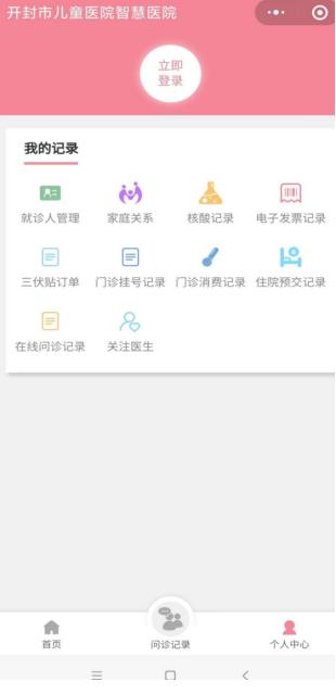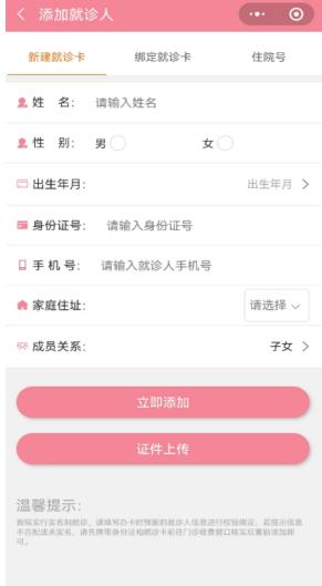 進(jìn)入首頁后,點(diǎn)擊右下角個人中心——點(diǎn)擊立即登錄獲得微信授權(quán)——就診人管理——添加就診人——新建就診卡或者綁定就診卡——填寫就診人信息
