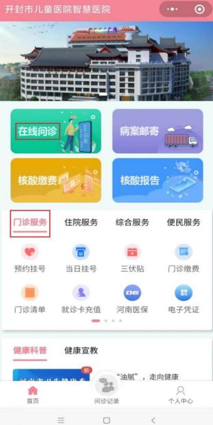 就診卡辦理或綁定完成后,返回首頁,點(diǎn)擊【門診服務(wù)】上方的【在線問診】圖標(biāo),即可進(jìn)入在線問診板塊。