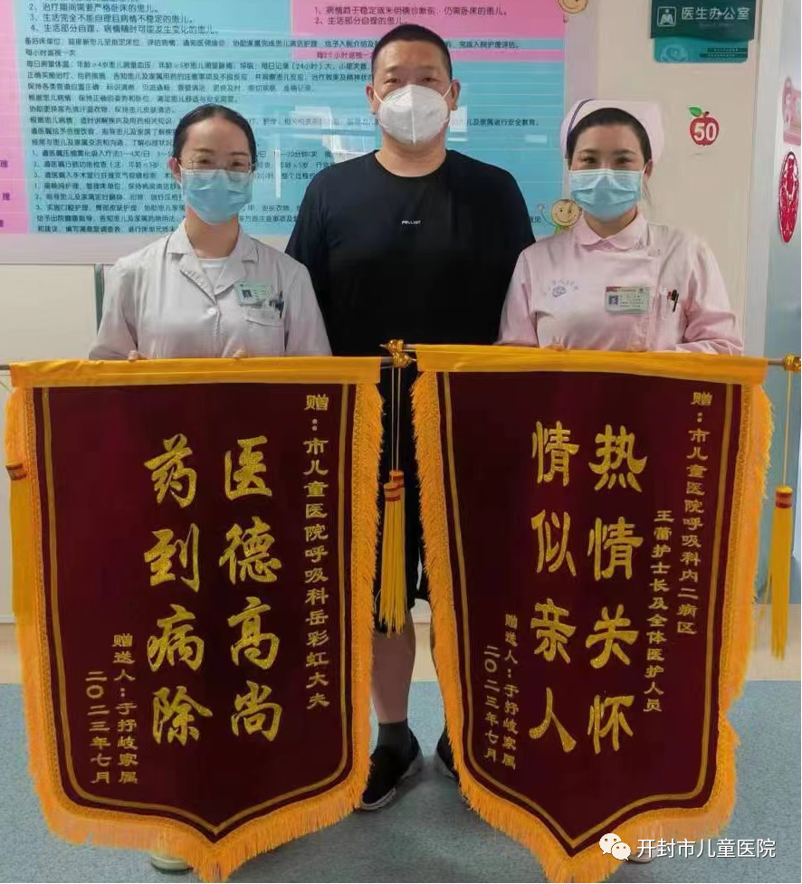 7月27日早上,已出院患兒于××家屬手拿兩面錦旗來到了我們科室,“我是來向內(nèi)六科的全體醫(yī)護(hù)人員表示感謝的、謝謝你們,是你們高尚的技術(shù)和溫暖的關(guān)懷使我家孩子早日康復(fù)!患兒家屬邊說邊展開兩面錦旗,他把紅色錦絨背景下“醫(yī)德高尚、藥到病除”的錦旗送給了岳彩虹大夫,把“熱情關(guān)懷、情似親人”送給護(hù)士長王蕾。家長激動的說:“今天我親自送上這面錦旗,以表達(dá)我對內(nèi)六科全體醫(yī)護(hù)人員的感激之情,感謝王主任及岳大夫以精湛的醫(yī)術(shù)、高尚的醫(yī)德使我們的孩子早日康復(fù);感謝王蕾護(hù)士長對我們無微不至的關(guān)懷,感謝護(hù)士姐妹們悉心照顧,你們和藹的態(tài)度、無私的奉獻(xiàn)使我們感受到家的溫暖,你們不愧白衣天使的稱號!