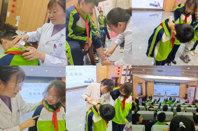 張醫(yī)生通過生動有趣的古代故事介紹了“艾”和“灸”的起源,并介紹了什么是艾灸—它是利用艾條或艾柱在人體特定穴位上進(jìn)行燃燒、熏烤,以達(dá)到預(yù)防和治療疾病的目的。之后給孩子們講述了小雪節(jié)氣的常用保健穴位“大椎”和“三陰交”,隨后演示了兩個(gè)穴位的取穴方法。課堂上孩子們學(xué)習(xí)認(rèn)真,氛圍活躍,現(xiàn)場抽取幾名孩子體驗(yàn)找穴位位置進(jìn)行互動,孩子們踴躍參加,自信滿滿地分享自己學(xué)習(xí)成果。