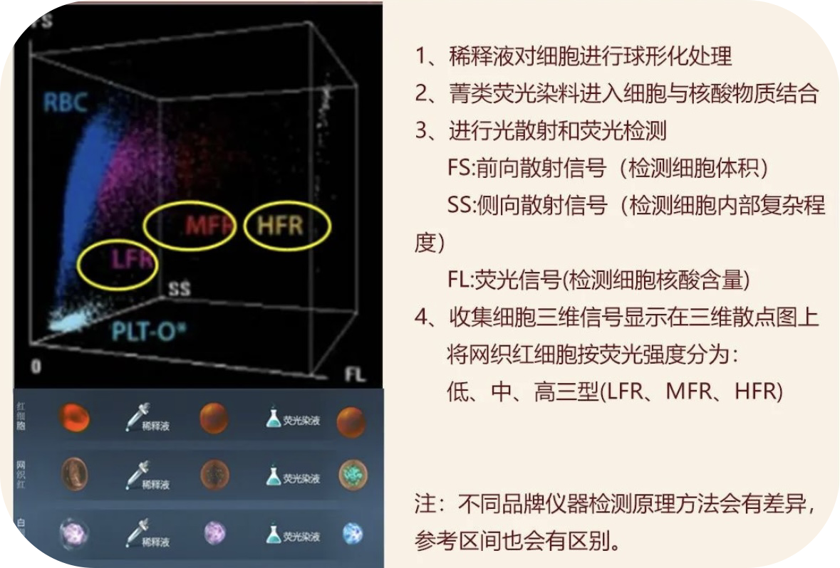 2. 血液分析儀法:將熒光染料對網(wǎng)織紅細胞進行染色,結(jié)合激光散射法及流式細胞術(shù)進行網(wǎng)織紅細胞檢測。熒光強度與細胞內(nèi)RNA含量呈正比,根據(jù)熒光強度的不同,網(wǎng)織紅細胞可分為低熒光強度(LFR)、中熒光強度(MFR)和高熒光強度(HFR),其中MFR和HFR屬于未成熟網(wǎng)織紅細胞(IFR)。儀器法具有快速簡便、重復(fù)性好、攜帶污染率低等優(yōu)點,是現(xiàn)在檢測網(wǎng)織紅細胞的主流方法。