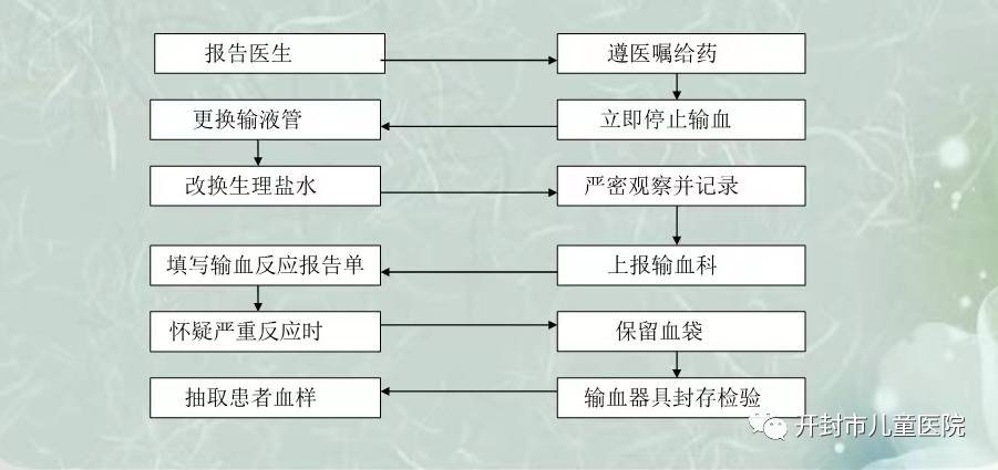 5. 發(fā)生輸血反應(yīng)立即減慢或停止輸血,用生理鹽水維持靜脈通暢,通知醫(yī)生給予對(duì)癥處理,保留余血通知血庫(kù),嚴(yán)密觀察病情變化并記錄。
