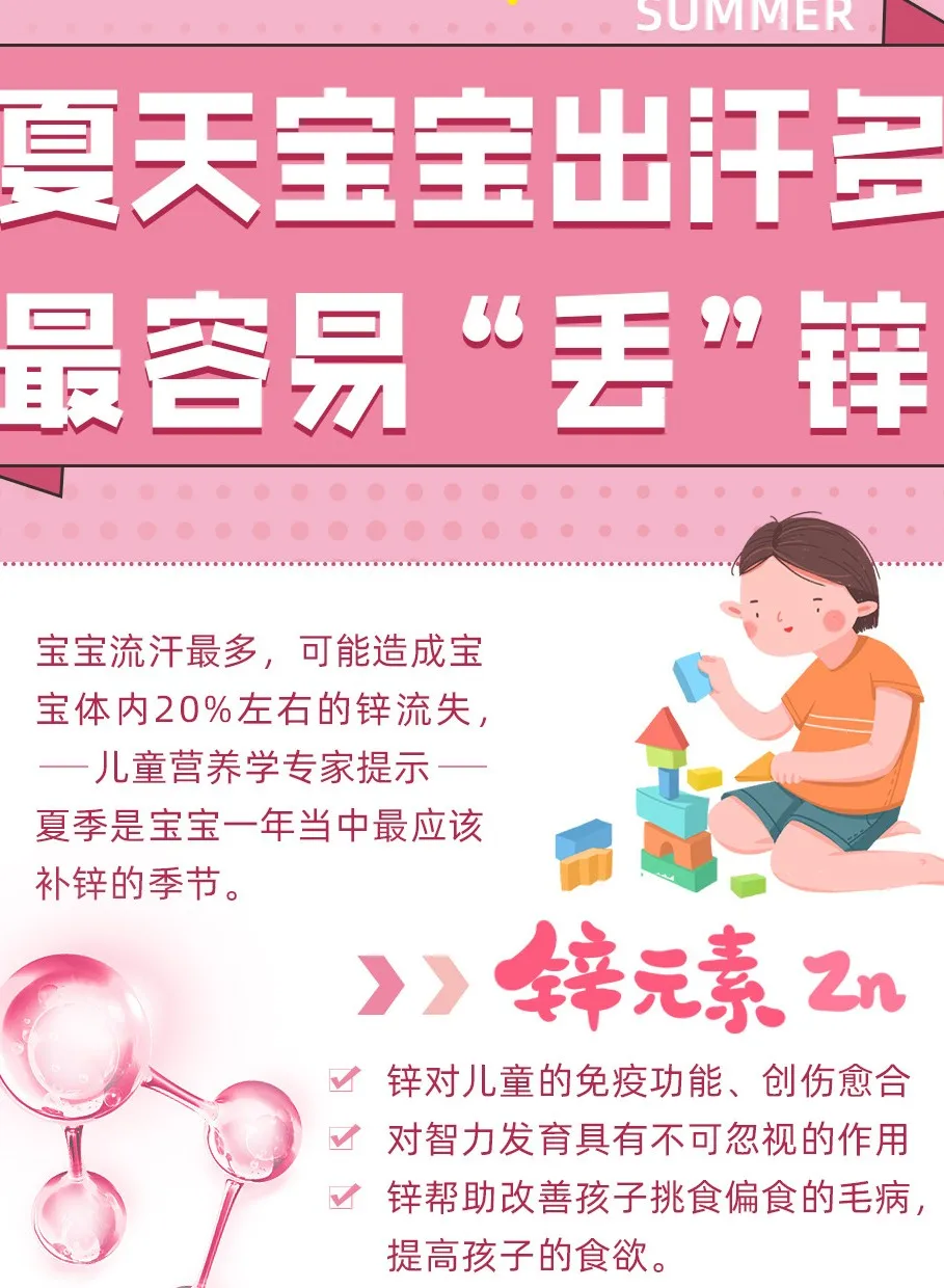 鋅是寶寶成長(zhǎng)必需的微量元素,被譽(yù)為“生命之花”、“智力之源”。夏季氣溫高,孩子出汗量增加,體內(nèi)的鋅元素會(huì)隨著汗液和尿液流失,容易出現(xiàn)鋅缺乏。此外,夏季兒童愛(ài)吃冷飲、水果等清涼食物,這些食物富含的維生素C和鈣元素會(huì)降低身體對(duì)鋅的吸收,增加了缺鋅的風(fēng)險(xiǎn)。