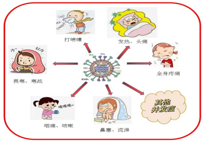 流行性感冒,簡稱流感,是由流感病毒引起的急性呼吸道傳染病,屬于丙類傳染病。流感主要通過空氣飛沫在人與人之間直接傳播,也可以通過口腔、鼻腔、眼睛等黏膜直接或間接接觸傳播。人群普遍易感,以學(xué)齡兒童和學(xué)齡前兒童發(fā)病率最高,起病初期傳染性最強(qiáng)。主要的傳染源為患者和隱性感染者。兒童流感多突然起病,主要癥狀為突發(fā)高熱、頭痛、畏寒、寒戰(zhàn),多伴全身酸痛、乏力、食欲減退等全身癥狀,也會出現(xiàn)咽痛、咳嗽、鼻塞或流涕、惡心、嘔吐、腹瀉等,有的可引起肺炎、支氣管炎等并發(fā)癥。