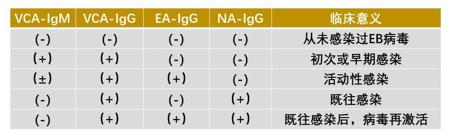 因此一般用EBV-VCA-IgM,EBV-VCA-IgG,EBV-EA-IgG,EBV-NA-IgG的檢測(cè)結(jié)果區(qū)分EBV原發(fā)感染和既往感染。