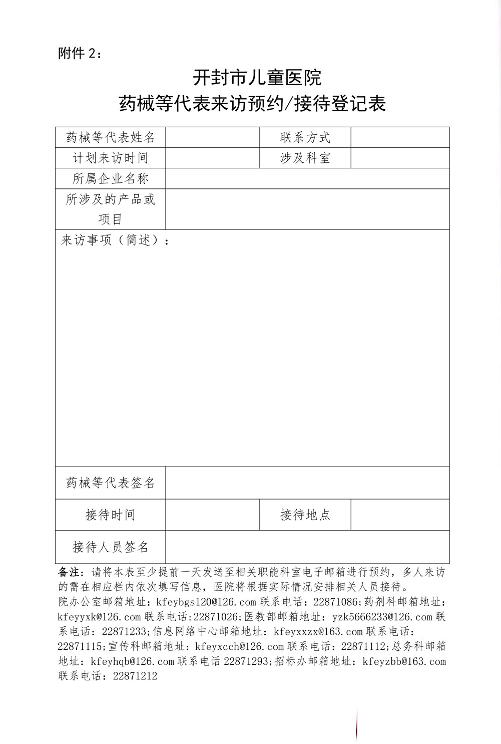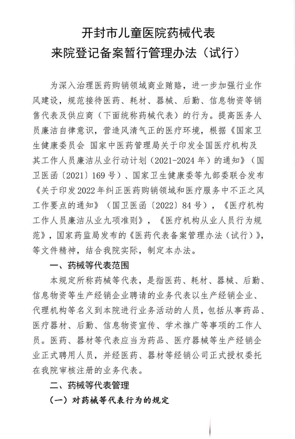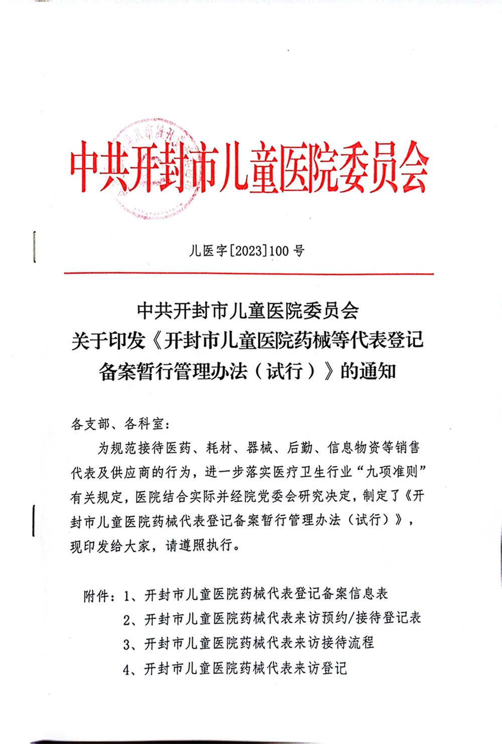 2023.100號 開封市兒童醫(yī)院 關(guān)于印發(fā)《開封市兒童醫(yī)院藥械等代表登記備案暫行管理辦法(試行)》的通知