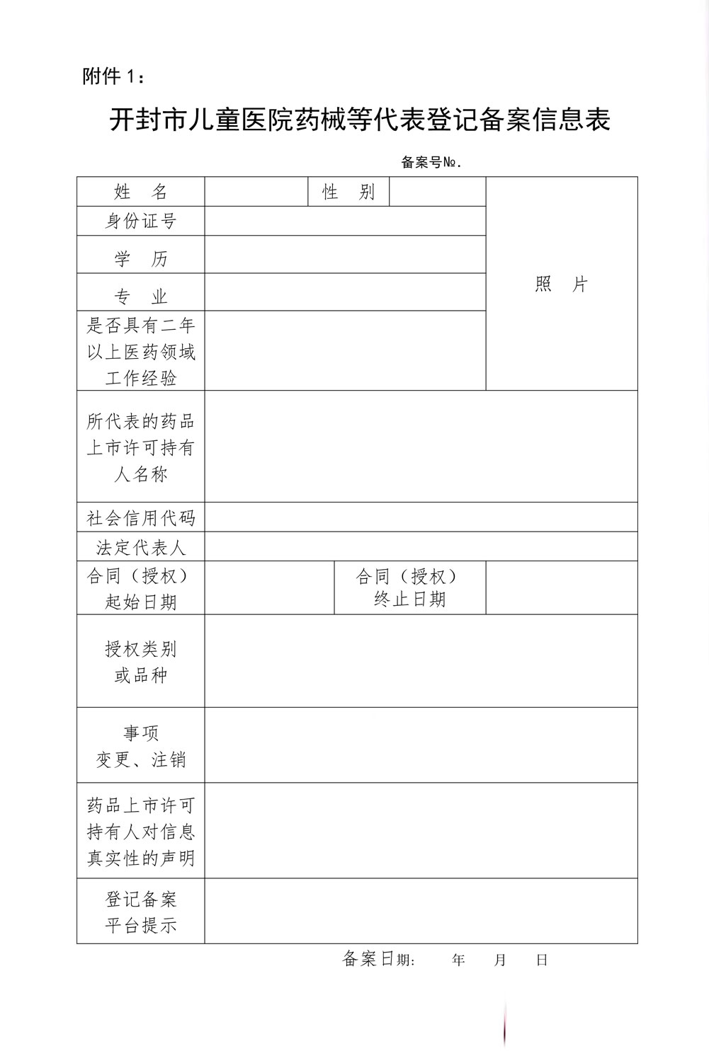 點擊下載 附件:開封市兒童醫(yī)院藥械等代表登記備案暫行管理辦法附件.docx 大?。? 25KB