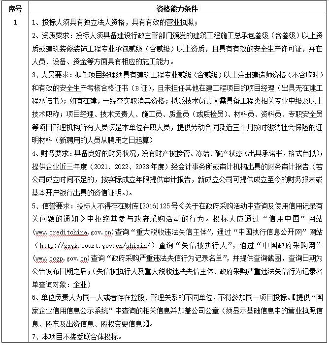 2.2.2、資質(zhì)要求:投標(biāo)人須具備建設(shè)行政主管部門頒發(fā)的建筑工程施工總承包叁級(含叁級)以上資質(zhì)或建筑裝修裝飾工程專業(yè)承包貳級(含貳級)以上資質(zhì),且具有有效的安全生產(chǎn)許可證,并在人員、設(shè)備、資金等方面具有相應(yīng)的施工能力。